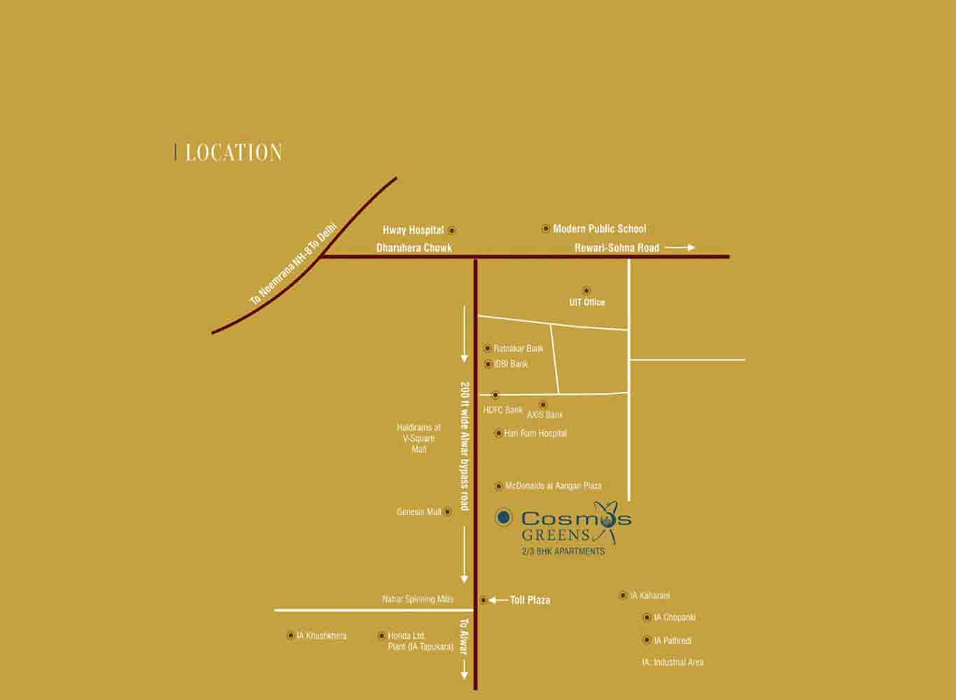 What makes Cosmos Greens, Bhiwadi a project more than just fancy buildings and tall towers is the fact that Cosmos Greens is a project with close proximity to Indira Gandhi International Airport (IGIA) while managing to ensure best location wise availability for daily routine work like markets, banks etc. Find everything right at your doorstep